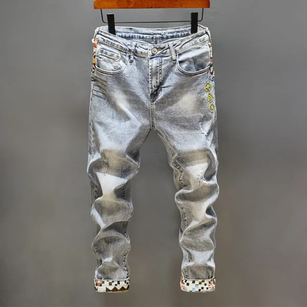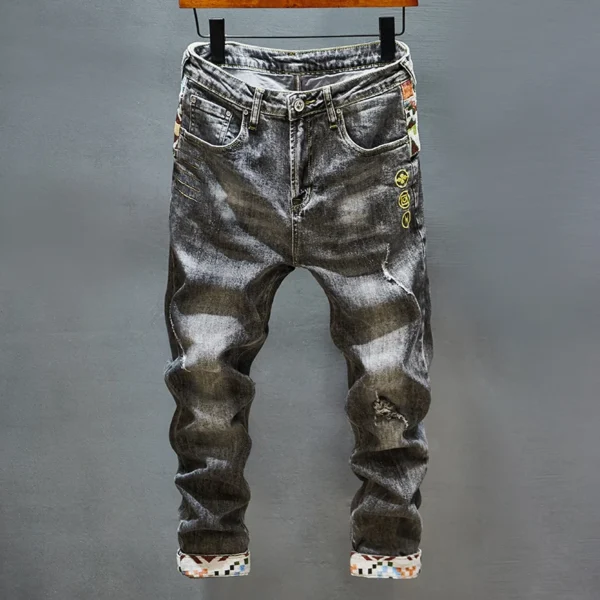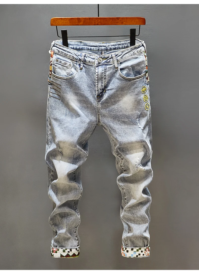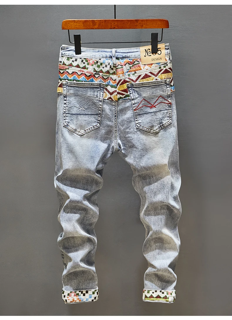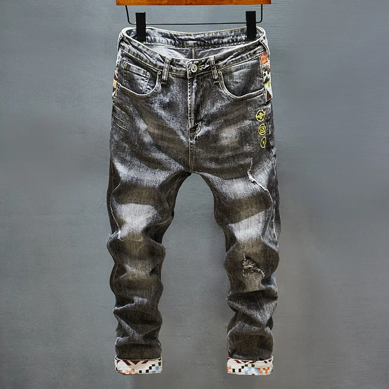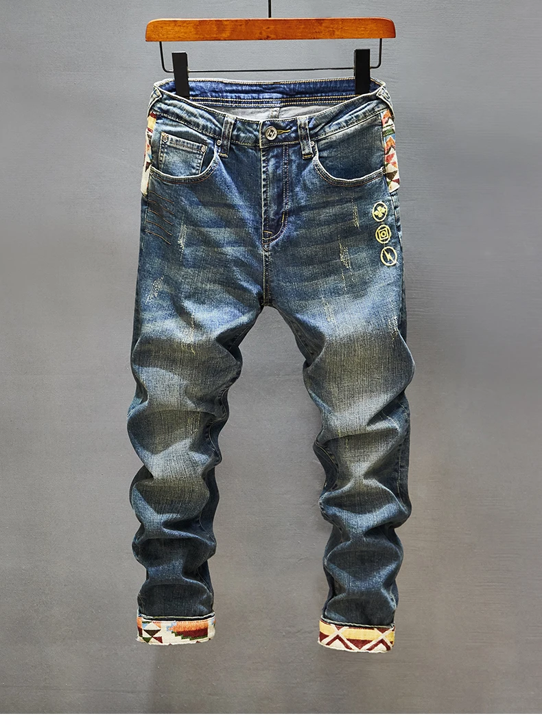 Embroidered Men’s Stone Washed Denim Jeans Street Fashion Design Pattern Slim Fit Stone Jeans