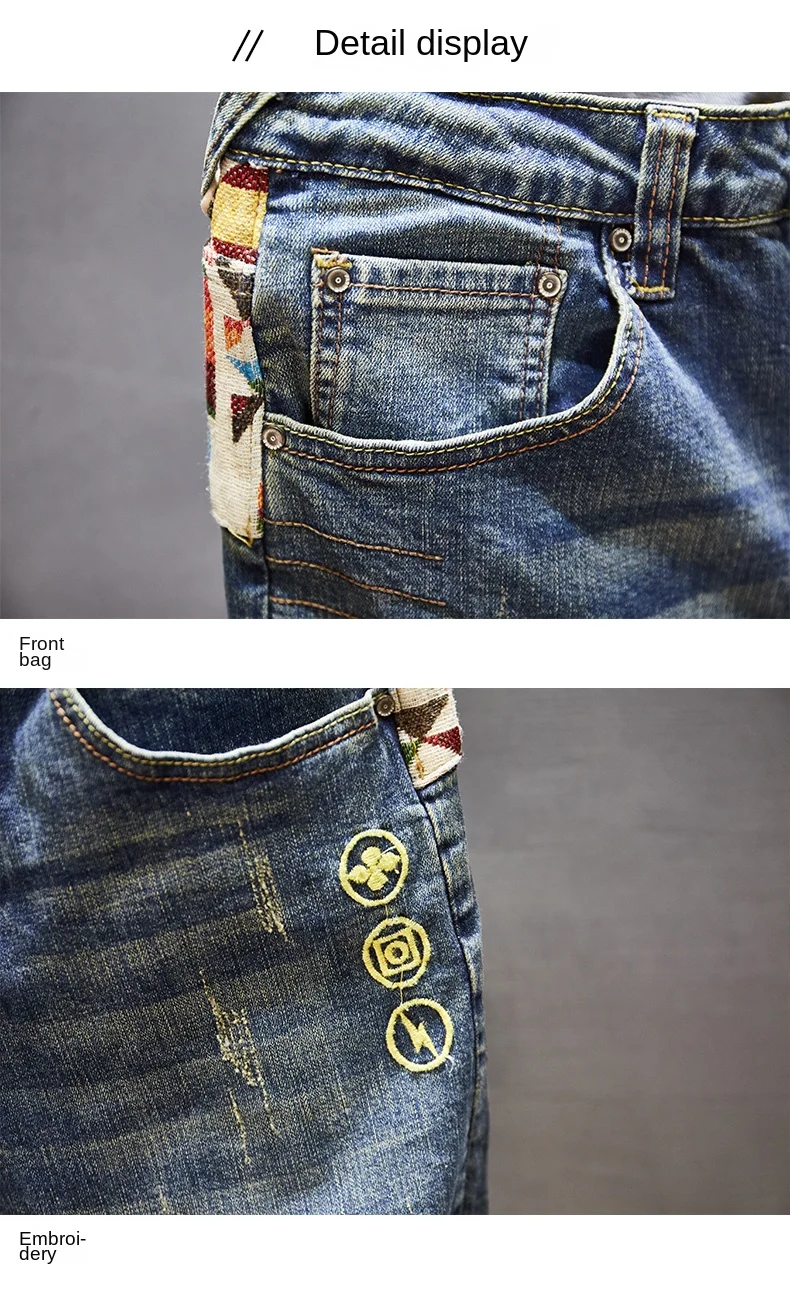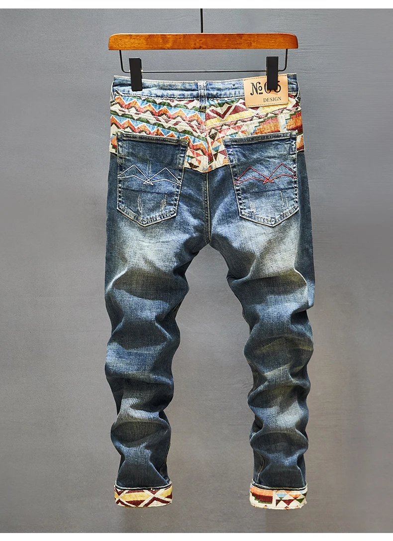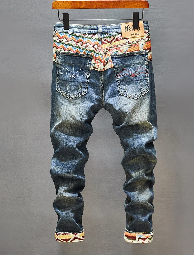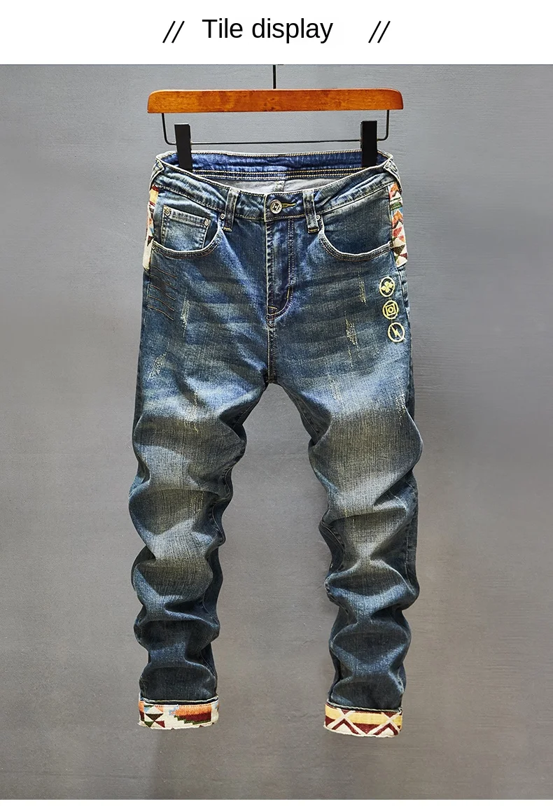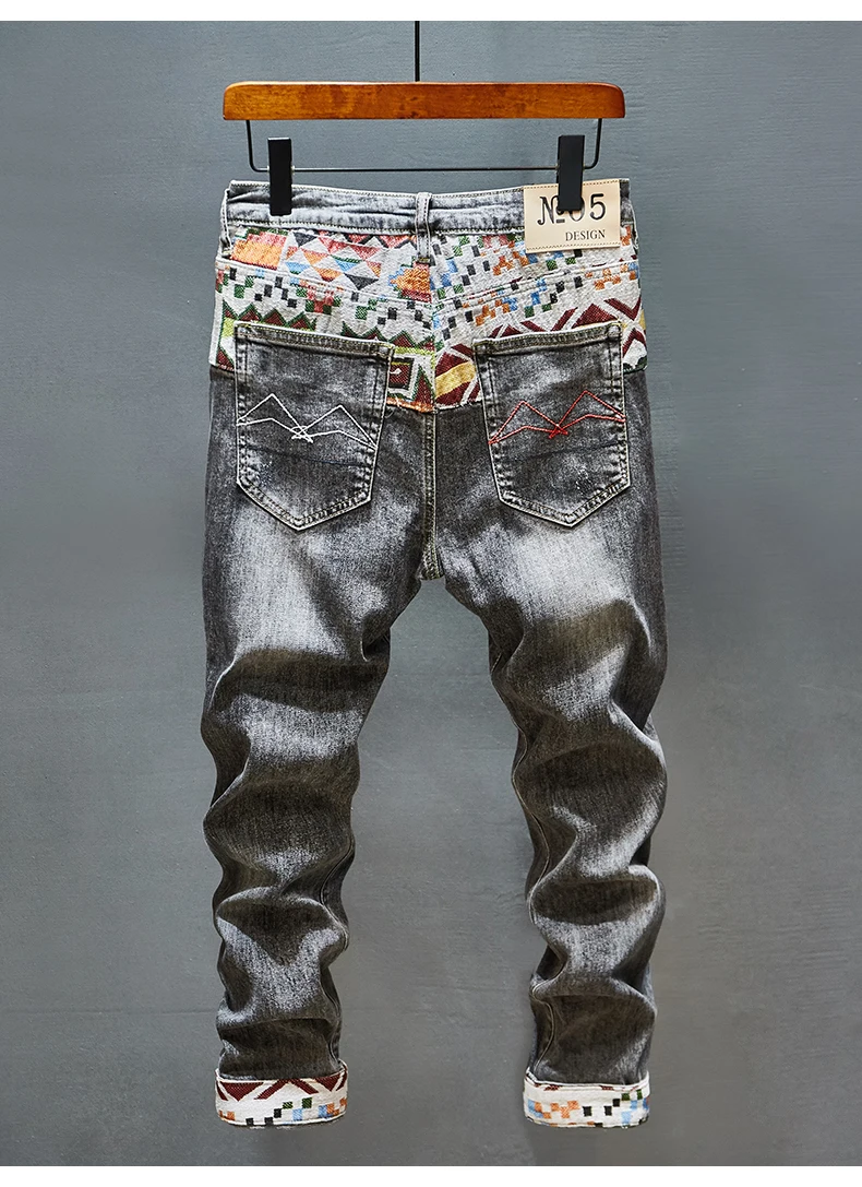 Embroidered Men’s Stone Washed Denim Jeans Street Fashion Design Pattern Slim Fit Stone Jeans