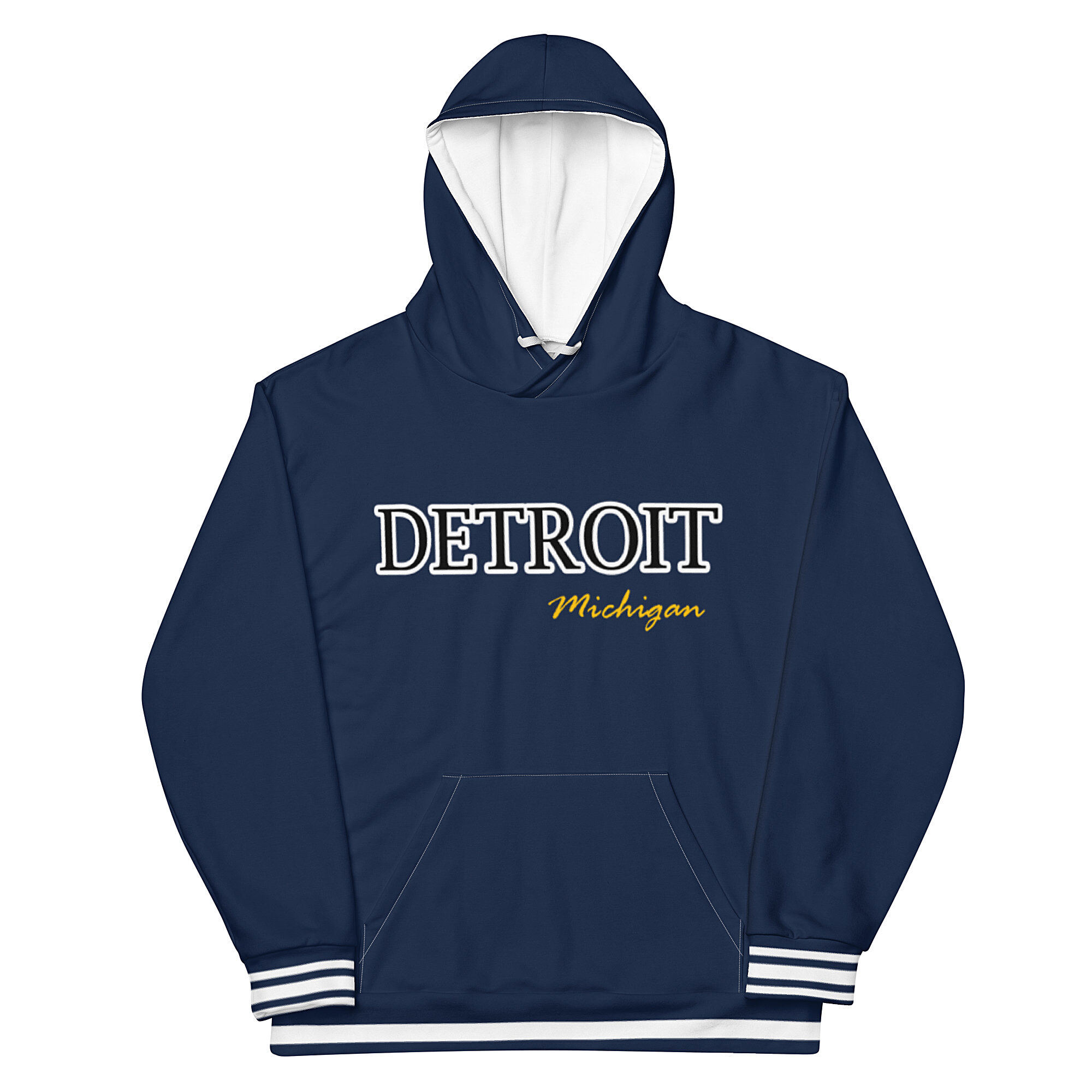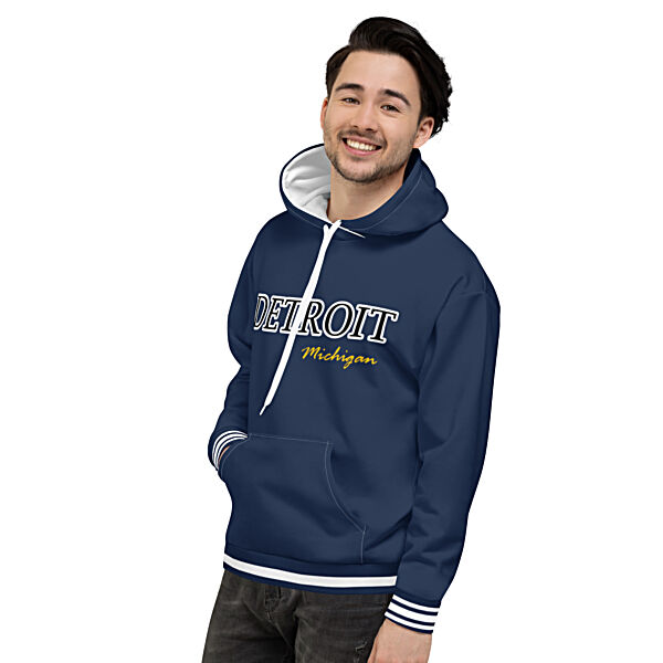 Navy Detroit Michigan Unisex Hoodie BDH-32114 has a soft outside with a vibrant print and an even softer brushed fleece inside. The hoodie has a relaxed fit, and it’s perfect for wrapping yourself into on a chilly evening.